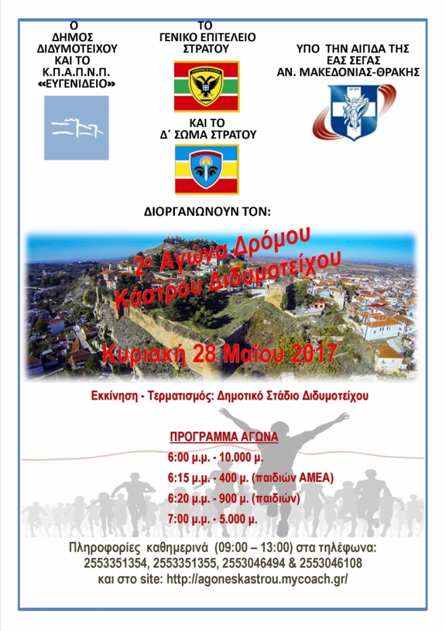 Εγγραφές θα πραγματοποιούνται καθημερινά, από 2 Μαίου στο ΕΥΓΕΝΙΔΕΙΟ, στις Λέσχες Αξιωματικών Διδυμοτείχου και Ορεστιάδας και στην ηλεκτρονική πλατφόρμα http://agoneskastrou.mycoach.gr/.