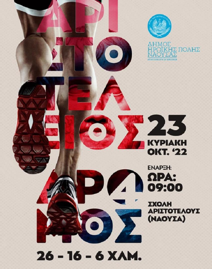 Η Δήμος Ηρωικής Πόλης Νάουσας, και ο Σύνδεσμος Βετεράνων Αθλητών Στίβου Νάουσας, η Γ.Ε. Νάουσας, υπό την αιγίδα της Ελληνικής Ομοσπονδίας Συλλόγων Λαϊκού Μαζικού Αθλητισμού - Υπεραποστάσεων, Ε.Ο.Σ.Λ.Μ.Α.Υ. συνδιοργανώνουν τον λαϊκό αγώνα «4ος ΑΡΙΣΤΟΤΕΛΕΙΟΣ Δρόμος Αντοχής» συνολικής απόστασης 26 χλμ. (Σχολή Αριστοτέλους – Στράντζα – Γιαννακοχώρι – Μαρίνα – Λευκάδια - Σχολή Αριστοτέλους) τους παράλληλους αγώνες 16 & 6 χλμ..