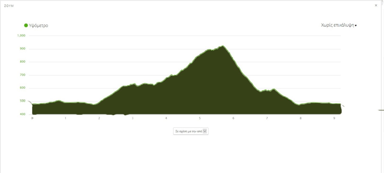 Θετική υψομετρική 550μ. 7,5 χιλιόμετρα μονοπάτι, 0,5 χιλιόμετρα δασικός και 2 χιλιόμετρα άσφαλτος.
