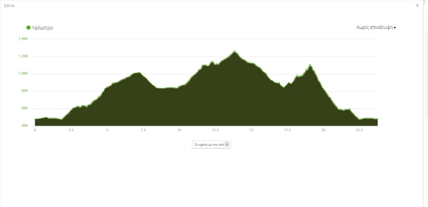 Θετική υψομετρική 1400μ. 20 χιλιόμετρα μονοπάτι, 2,5 χιλιόμετρα δασικός και 1,5 χιλιόμετρα άσφαλτος.