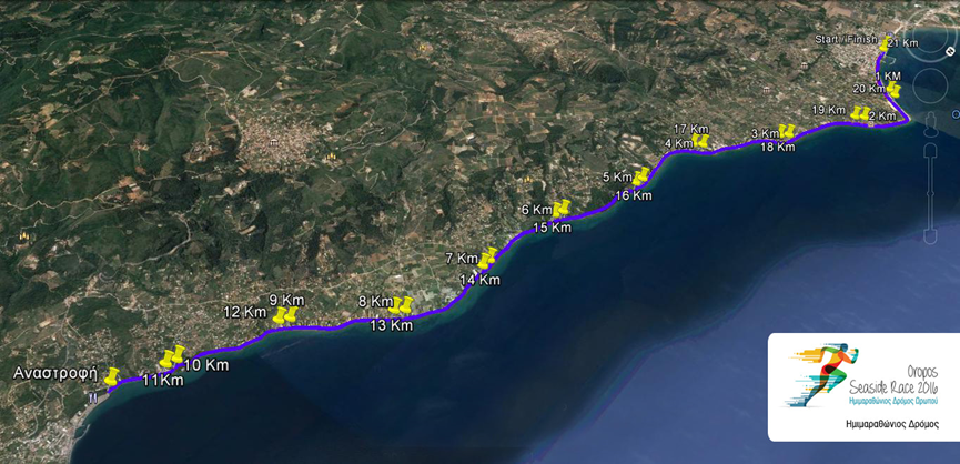 Περιγραφή διαδρομής: Η εκκίνηση όπως και ο τερματισμός του αγώνα θα είναι στο λιμάνι του Ωρωπού (είσοδος) και η διαδρομή θα είναι παράλληλα με τη θάλασσα στο δρόμο προς τους Αγ. Αποστόλους, αναστροφή στα 10,55 χλμ. και επιστροφή από το ίδιο δρόμο.