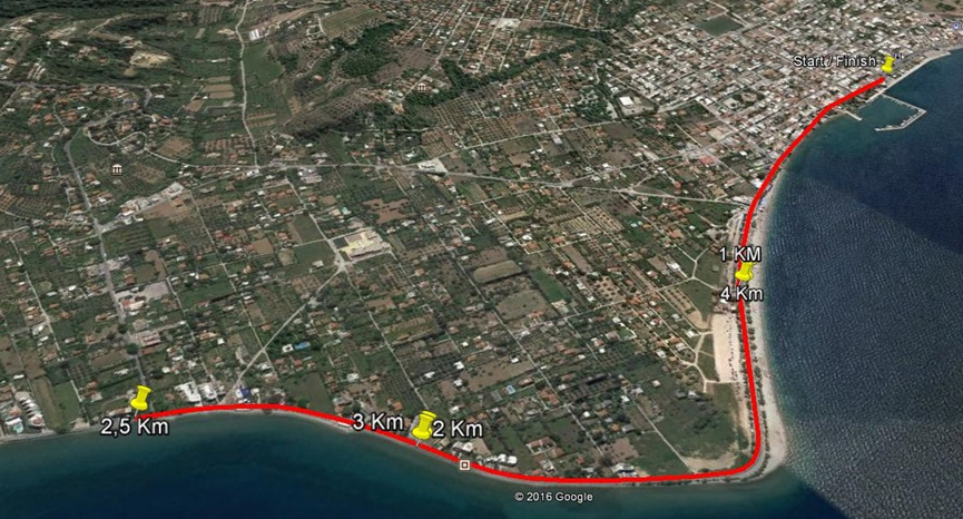 Περιγραφή διαδρομής: Η εκκίνηση όπως και ο τερματισμός του αγώνα θα είναι στο λιμάνι του Ωρωπού (είσοδος) και η διαδρομή θα είναι παράλληλα με τη θάλασσα στο δρόμο προς τους Αγ. Αποστόλους, αναστροφή στα 2,5 χλμ. και επιστροφή από το ίδιο δρόμο.