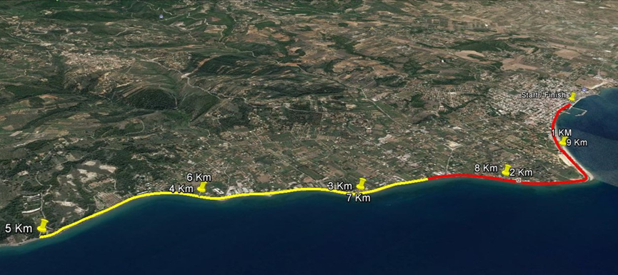 Περιγραφή διαδρομής: Η εκκίνηση όπως και ο τερματισμός του αγώνα θα είναι στο λιμάνι του Ωρωπού (είσοδος) και η διαδρομή θα είναι παράλληλα με τη θάλασσα στο δρόμο προς τους Αγ. Αποστόλους, αναστροφή στα 5 χλμ. και επιστροφή από το ίδιο δρόμο.