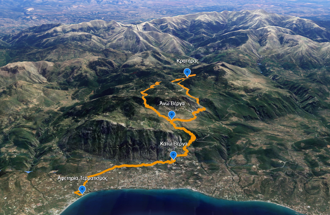 Πλέον το τοπίο έχει αλλάξει. Η επικράτεια της πέτρας (ξερολιθιές, αλώνια, καλύβες και στέρνες) εναλλάσσεται με το δάσος, τα ξέφωτα και τα βοσκοτόπια έως ότου αντικρύσουμε μπροστά μας τον μεγαλοπρεπή Ταΰγετο όπου εδώ μας αποκαλύπτει μια άγνωστη σε πολλούς πλευρά του. Κατεβαίνοντας οι εκπλήξεις συνεχίζονται, περνώντας κάτω από βράχους, μενίρ και ντολμέν, σαν να είναι βγαλμένα κατευθείαν από τον κόσμο του Αστερίξ και του Οβελίξ φτάνουμε στη μεγαλύτερη έκπληξη που είναι ο «Κρατήρας».