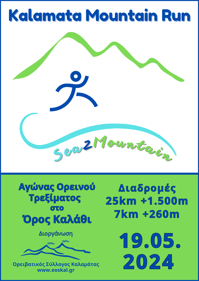 Ο Ορειβατικός Σύλλογος Καλαμάτας σε συνεργασία με τον Δήμο Καλαμάτας διοργανώνει στις 19 Μαΐου 2024 το 1o Kalamata Mountain Run στο οποίο περιλαμβάνονται 2 αγώνες ορεινού τρεξίματος:
