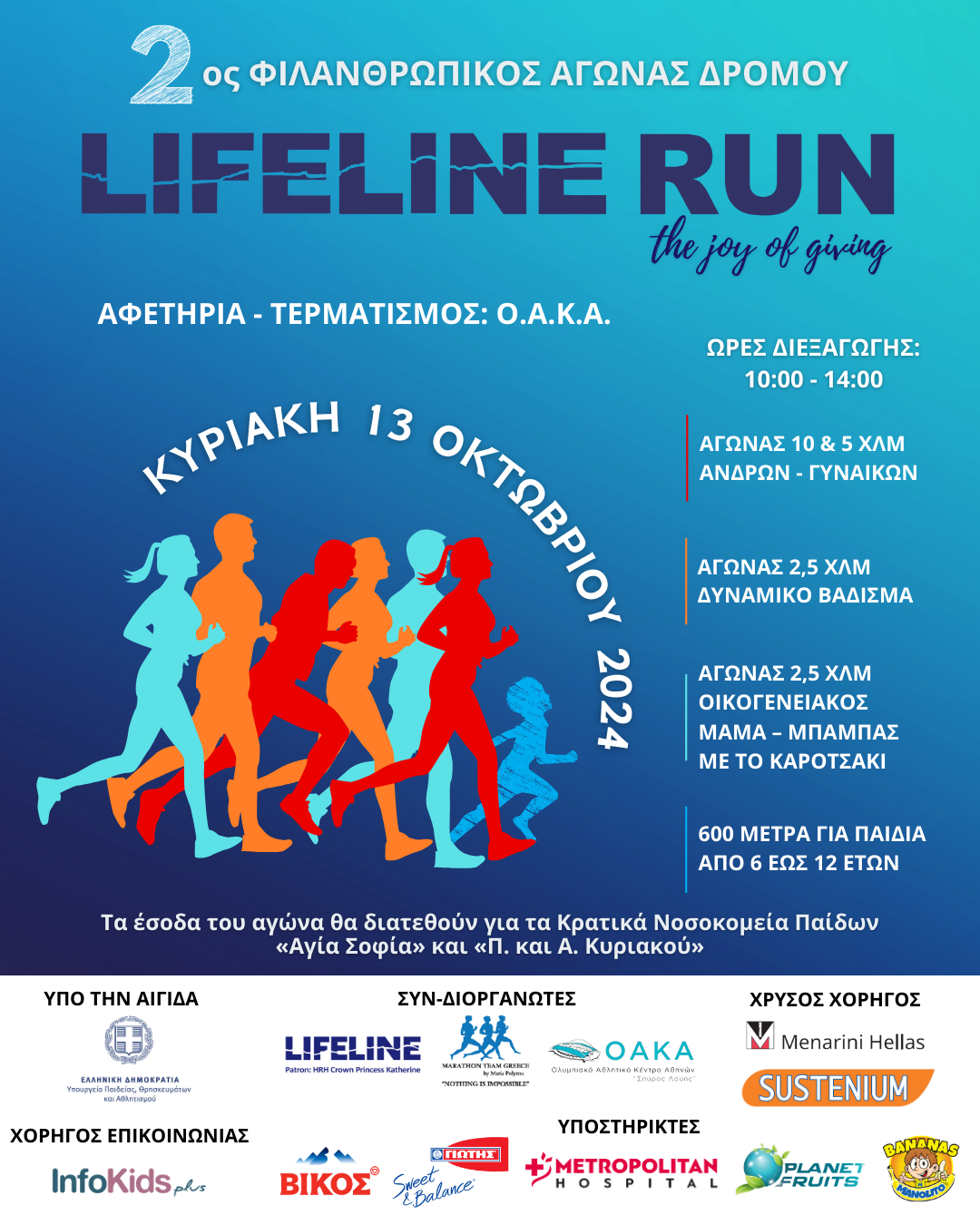 O ανθρωπιστικός οργανισμός «Γραμμή Ζωής Ελλάς» (Lifeline Hellas) www.lifelinegr.org, η MARATHON TEAM GREECE by Maria Polyzou και το Ο.Α.Κ.Α. (Ολυμπιακό Αθλητικό Κέντρο Αθηνών ¨Σπύρος Λούης¨) συνδιοργανώνουν τον 2ο Φιλανθρωπικό αγώνα δρόμου με την επωνυμία Lifeline Run 2024, με σκοπό την υποστήριξη των νοσοκομείων παίδων της Αθήνας «Αγία Σοφία» και «Π. & Α. Κυριακού» με την προσφορά θερμοκοιτίδων. Όλα τα έσοδα του αγώνα θα διατεθούν για αυτό τον σκοπό.