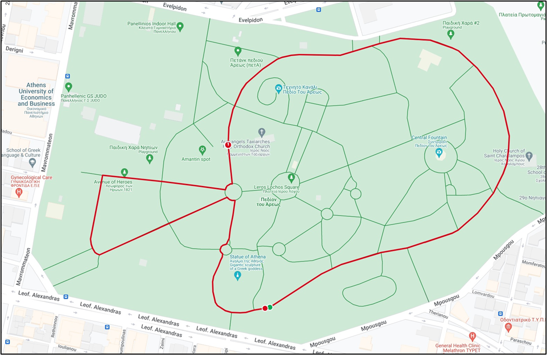 Εκκίνηση από το άγαλμα της Αθηνάς, πέρασμα από τον Αγ. Χαράλαμπο, τους Αγ. Ταξιάρχες, δεξιά στο δρόμο με τις προτομές των Ηρώων του 1821, αριστερά στον χωμάτινο δρόμο, αριστερά στο άγαλμα του Κωνσταντίνου, πρώτη στροφή δεξιά και έξοδος στο σημείο εκκίνησης. Με 3 στροφές θα καλυφθούν τα 5 χιλιόμετρα.