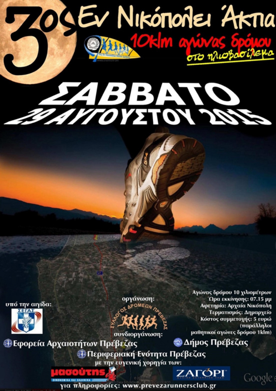 Η διαδρομή του είναι ιδιαίτερου φυσικού κάλους, ενώ η αφετηρία βρίσκεται μπροστά από την Πύλη των Παλαιοχριστιανικών Τειχών της Αρχαίας Νικόπολης, η οποία είναι ένα από τα σημαντικότερα αρχαιολογικά μνημεία στον κόσμο. Ακόμη, την ημέρα διεξαγωγής των αγώνων και στο πλαίσιο της συμμετοχής της Εφορείας Αρχαιοτήτων Πρέβεζας στον εορτασμό της Αυγουστιάτικης Πανσελήνου το Αρχαιολογικό Μουσείο της Νικοπόλεως, το οποίο βρίσκεται στην διαδρομή του αγώνα, θα παραμείνει ανοιχτό για το κοινό, πέραν του ωραρίου και έως τις 10:00μ.μ.. Τέλος, ενημερώνουμε ότι φέτος ο αγώνας διεξάγεται υπό την αιγίδα του ΣΕΓΑΣ.