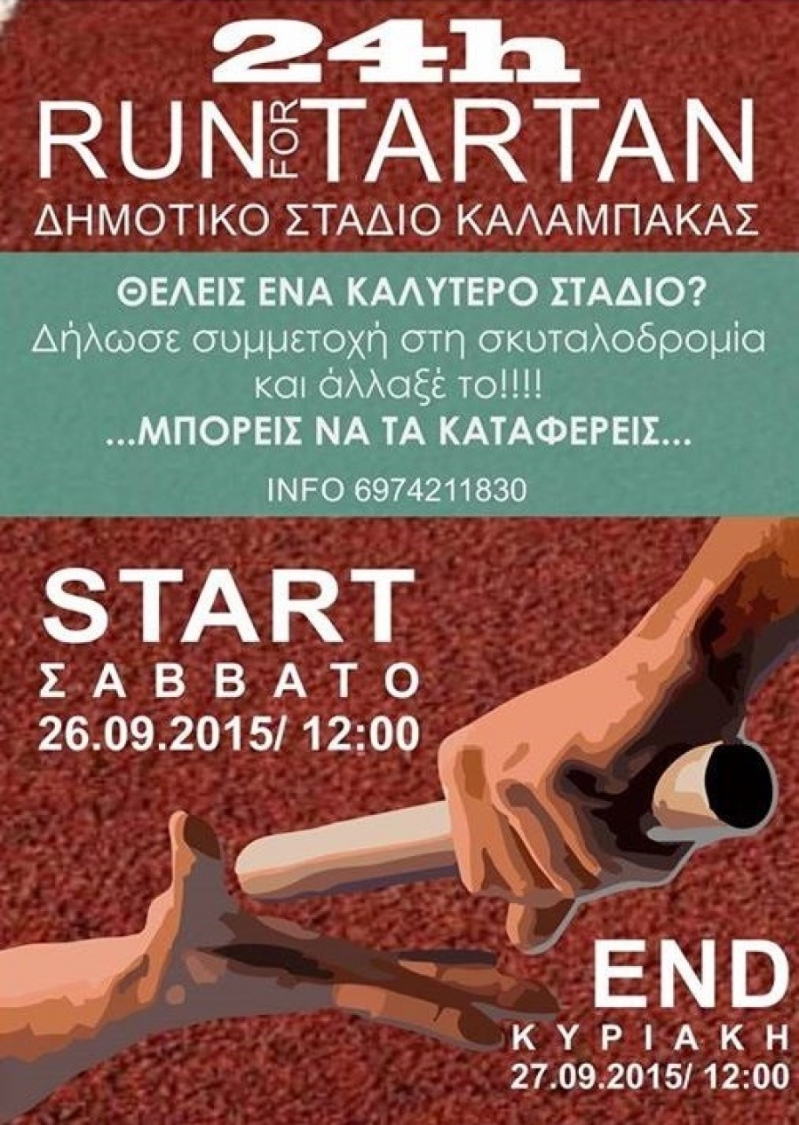 Δήλωσε τώρα συμμετοχή στη σκυταλοδρομία 24h RUN 4 TARTAN, που θα πραγματοποιηθεί στο Δημοτικό Στάδιο Καλαμπάκας κι άλλαξέ το για πάντα!