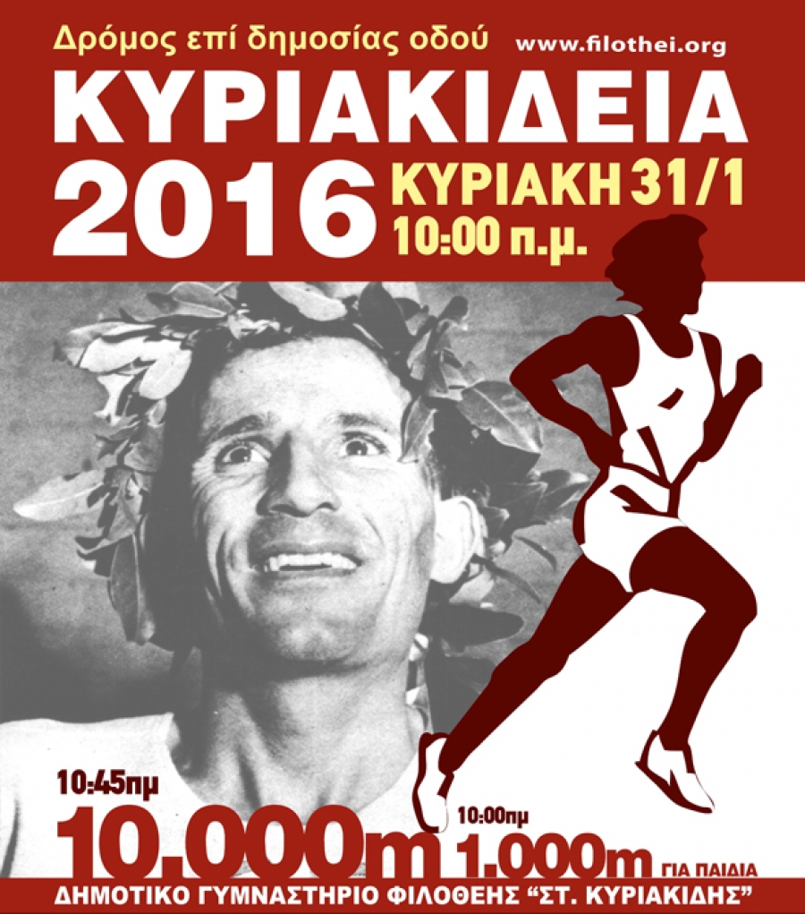 «O Αθλητικός Όμιλος Φιλοθέης και ο ΔΗΜΟΣ ΦΙΛΟΘΕΗΣ - ΨΥΧΙΚΟΥ, υπό την αιγίδα του Σ.Ε.Γ.Α.Σ, διοργανώνουν αγώνες δρόμου σε δημόσια οδό, με την επωνυμία «ΚΥΡΙΑΚΙΔΕΙΑ 2016».