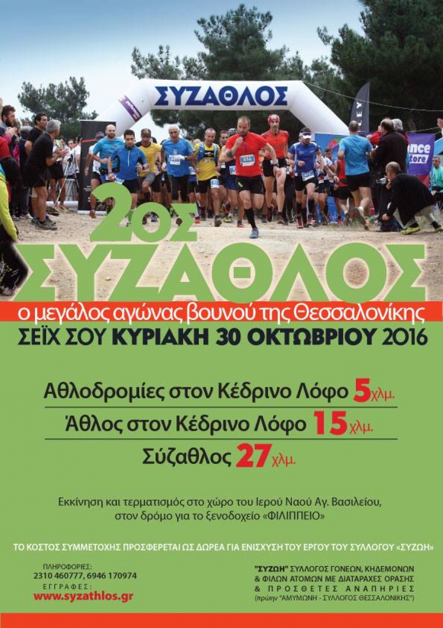 Η "ΣΥΖΩΗ" (Σύλλογος Γονέων Ατόμων με Διαταραχές Όρασης & Πρόσθετες Αναπηρίες) διοργανώνει στη Θεσσαλονίκη τον 2ο ΣΥΖΑΘΛΟ, ένα μεγάλο αγώνα βουνού με τρεις διαδρομές 27 χλμ, 14,5 χλμ και 5,4 χλμ για διαφορετικές απαιτήσεις. Σκοπός του αγώνα είναι όσο το δυνατό περισσότεροι συνάνθρωποί μας να ζήσουν τη χαρά της άθλησης, της επαφής με τη φύση, της υγιεινής ζωής, αλλά και να γνωρίσουν τις δράσεις του Συλλόγου ενισχύοντας ταυτόχρονα τις προσπάθειές μας για ισότιμη εκπαίδευση και κοινωνική ένταξη των παιδιών μας με τύφλωση και πρόσθετες αναπηρίες.