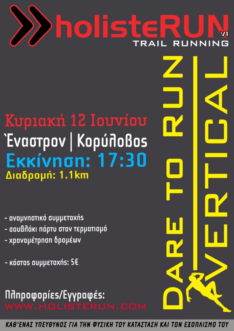 Ο καθένας δρομέας συμμετέχει στο #holisteRUN #verticalRUN με απόλυτα προσωπική του ευθύνη. Δεν έχει καμία απαίτηση ενάντια στους διοργανωτές για τυχών σωματική, υλική ή ηθική βλάβη από οποιαδήποτε αιτία και συναινεί στην ελεύθερη χρήση του ονόματος/εικόνας του.
