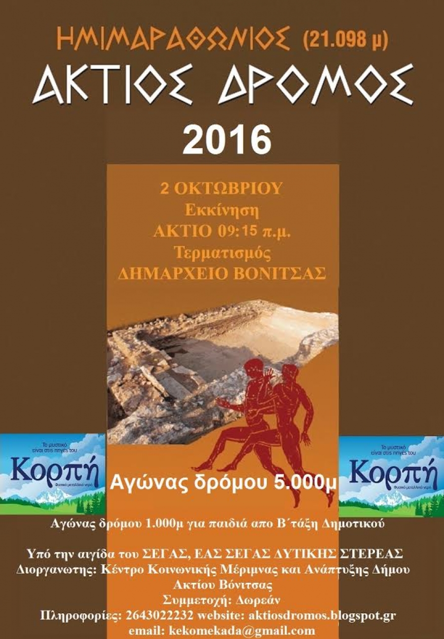 Ο αγώνας θα ξεκινήσει στις 09.15 από την περιοχή του Ακτίου Βόνιτσας ( περίπου στο ύψος του αεροδρομίου του Ακτίου) και θα καταλήξει στην παραλίας της Βόνιτσας ( στο Δημαρχείο του Δήμου Ακτίου Βόνιτσας ).