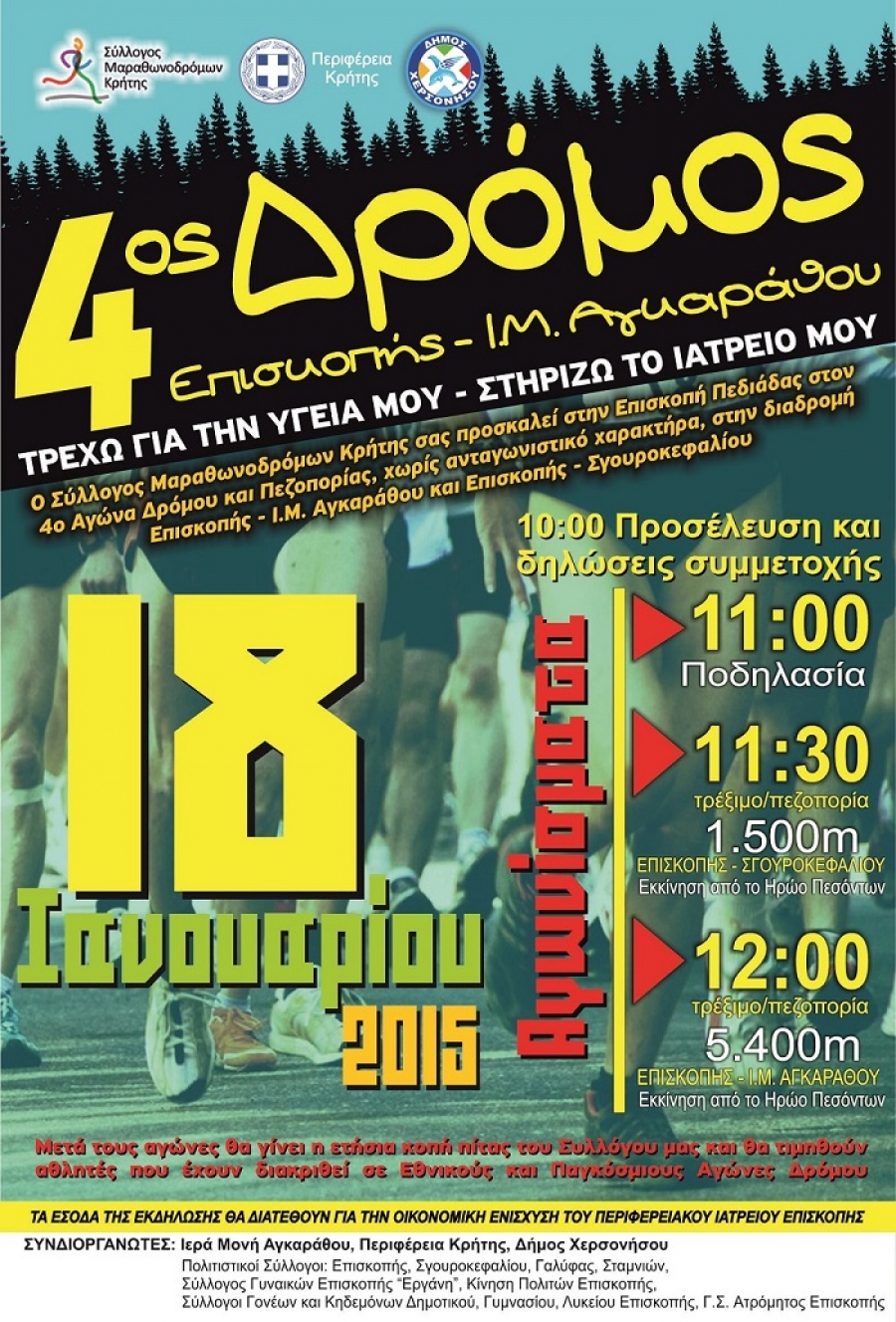 ΔΙΑΔΡΟΜΗ ΑΓΩΝΑ 5.000μ. Εκκίνηση 11:30 πμ : Ηρώον Πεσόντων Επισκοπής Πεδιάδος και τερματισμό στην Ιερά Μονή Αγκαράθου.