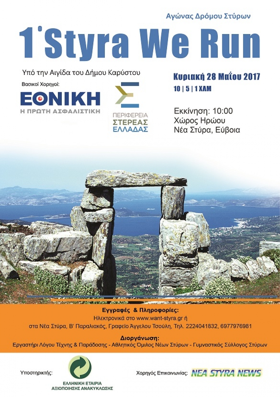 Ο 1ος Αγώνας Δρόμου Στύρων θα διανύσει μια υπέροχη διαδρομή που συνδυάζει αρμονικά τα παράλια και το λιμάνι των Νέων Στύρων με το ορεινό τοπίο αποπνέοντας έναν ισχυρό συμβολισμό για την προάσπιση της υγείας, την ένταξη του αθλητισμού στην ζωή μας και την προβολή της ομορφιάς της Νότιας Εύβοιας.