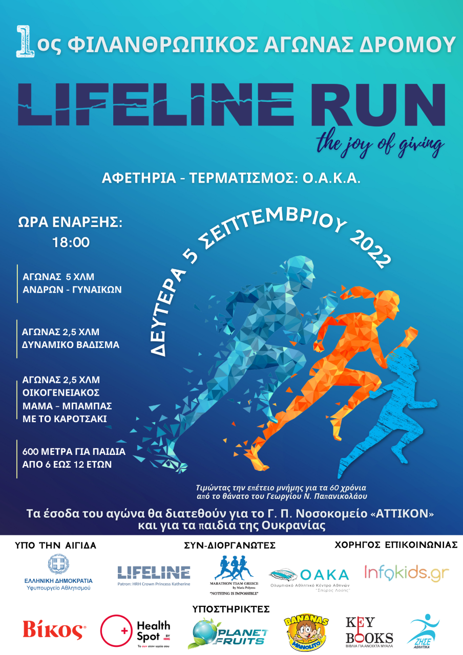 Ο φιλανθρωπικός αγώνας θα πραγματοποιηθεί υπό την αιγίδα του Υφυπουργείου Αθλητισμού, την παρουσία των ΑΒΥ Πρίγκιπα Αλέξανδρου και Πριγκίπισσας Αικατερίνης ενώ είναι αφιερωμένος στη μνήμη του Γιώργου Παπανικολάου, ο οποίος ανακάλυψε το τεστ ΠΑΠ που, κάθε χρόνο, σώζει εκατομμύρια γυναίκες από τον καρκίνο της μήτρας. Στο «Lifeline Run» θα συμμετάσχει ο «χρυσός» Παρολυμπιονίκης Θανάσης Γκαβέλας με «οδηγό» τον Υφυπουργό Αθλητισμού. Ο κ. Λευτέρης Αυγενάκης θα κρατάει το σκοινάκι του Παραολυμπιονίκη μας προκειμένου να τον οδηγεί. Στη διοργάνωση, μεταξύ άλλων, αναμένεται να πάρουν μέρος η δύο φορές πρωταθλήτρια Ευρώπης Αντιγόνη Ντρισμπιώτη, η οποία τρέξει στα 5.000 μ., η πρωταθλήτρια μεσαίων και μεγάλων αποστάσεων Αναστασία Μαρινάκου, ο Γιώργος Καραγκούνης κ.α.