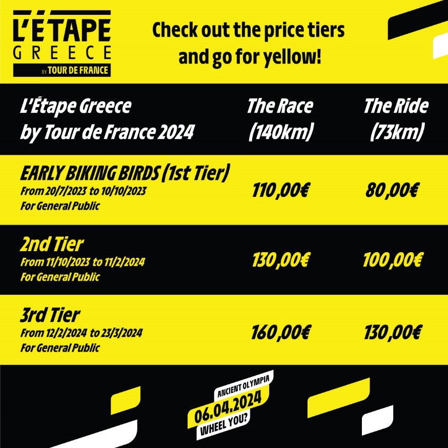 Περισσότερες πληροφορίες για τη διοργάνωση και τις ακριβείς διαδρομές θα ανακοινωθούν το επόμενο διάστημα, ενώ οι εγγραφές για τα EARLY BIKING BIRDS γίνονται ήδη εδώ: https://greece.letapebytourdefrance.com/.