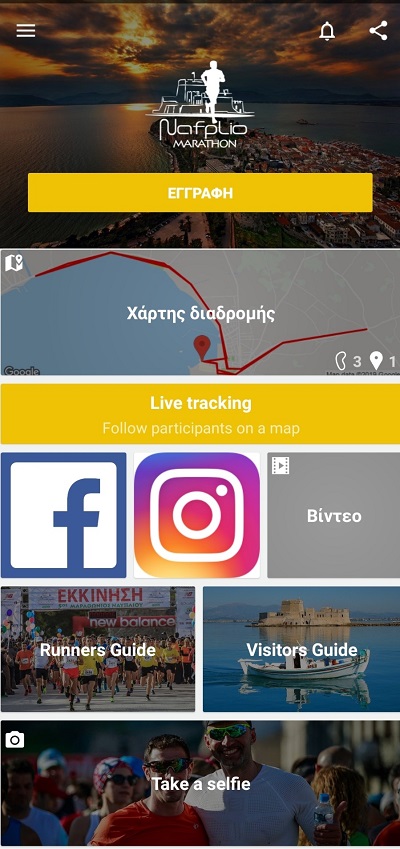 Η εφαρμογή προσφέρει επιπλέον και δυνατότητα εγγραφής στους αγώνες του Nafplio Marathon, τις βασικές συνδέσεις πληροφοριών σε αντιστοιχία με την ιστοσελίδα, ειδοποιήσεις από τα social media του αγώνα και μία γκάμα επιλογών για…selfies αγωνιστικές φωτογραφίες και όχι μόνο!