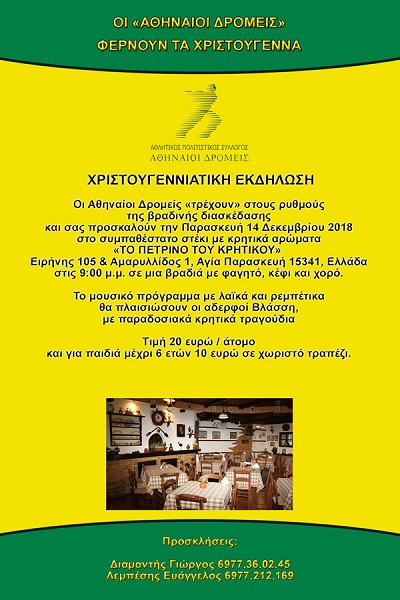 Οι Αθηναίοι Δρομείς «τρέχουν» στους ρυθμούς της βραδινής διασκέδασης και σας προσκαλούν την Παρασκευή 14 Δεκεμβρίου 2018 στο συμπαθέστατο στέκι με κρητικά αρώματα «ΤΟ ΠΕΤΡΙΝΟ ΤΟΥ ΚΡΗΤΙΚΟΥ» Ειρήνης 105 & Αμαρυλλίδος 1, Αγία Παρασκευή 15341, Ελλάδα ΧΑΡΤΗΣ
