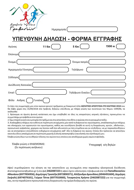 7) ΔΗΛΩΣΕΙΣ ΣΥΜΜΕΤΟΧΗΣ: Αφού συμπληρώσετε την αίτηση που θα βρείτε στο τέλος της προκήρυξης να την αποστείλετε ως συνημμένη στην παρακάτω ηλεκτρονική διεύθυνση dromeisgrevenon@yahoo.gr ή στο φαξ 2462087223 ή αφού έχετε ειδοποιήσει τηλεφωνικά στα τηλ. Τσιαρσιώτη Χρήστο (2462087222), Δημήτηρη Τραπέζα, Αλέξανδρο Δρουδάκη (6946491604), Δημήτρη Ζαψαλή (6974079181), Γιώργο Τόττα (6977010060) Παπαθανασίου Αθανάσιο (6977856956) για την συμμετοχή σας, να την παραδώσετε προσωπικά στους διοργανωτές την ημέρα διεξαγωγής του αγώναΤέλος φόρμας