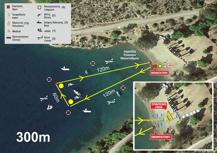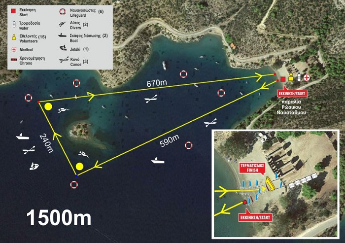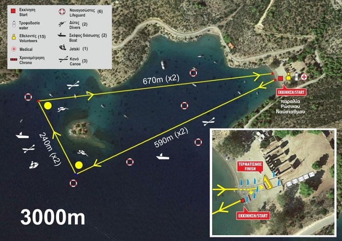 Η εκκίνηση θα δοθεί από την παραλία του Ρώσικου Ναύσταθμου. Οι αθλητές θα περάσουν δεξιόστροφα στις δύο επόμενες σημαδούρες καθώς και από το νησάκι Δασκαλιό και θα κολυμπήσουν προς το σημείο εκκίνησης. Εκεί θα εξέλθουν από το νερό, θα περπατήσουν – τρέξουν δεξιόστροφα, πάνω από τον τάπητα χρονομέτρησης και στην συνέχεια θα μπαίνουν πάλι στο νερό επαναλαμβάνοντας την ίδια διαδρομή πριν τερματίσουν στο σημείο από όπου δόθηκε η εκκίνηση. Ουσιαστικά η διαδρομή είναι δύο φορές το ίδιο τρίγωνο.
