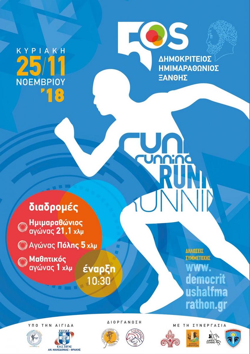 Ο Σύλλογος Δρομέων Ξάνθης “Xanthi Runners” και ο Α.Π.Σ. Διομήδης Ξάνθης σε συνεργασία με το Δήμο Ξάνθης, το Δήμο Αβδήρων, την Περιφέρεια Ανατολικής Μακεδονίας – Θράκης και το Δ΄ Σώμα Στρατού διοργάνωσαν την Κυριακή 25 Νοεμβρίου 2018 τον 5ο Δημοκρίτειο Ημιμαραθώνιο Δρόμο και παράλληλα τον Αγώνα πόλης 5.000μ. και τον παιδικό αγώνα 1.000μ.